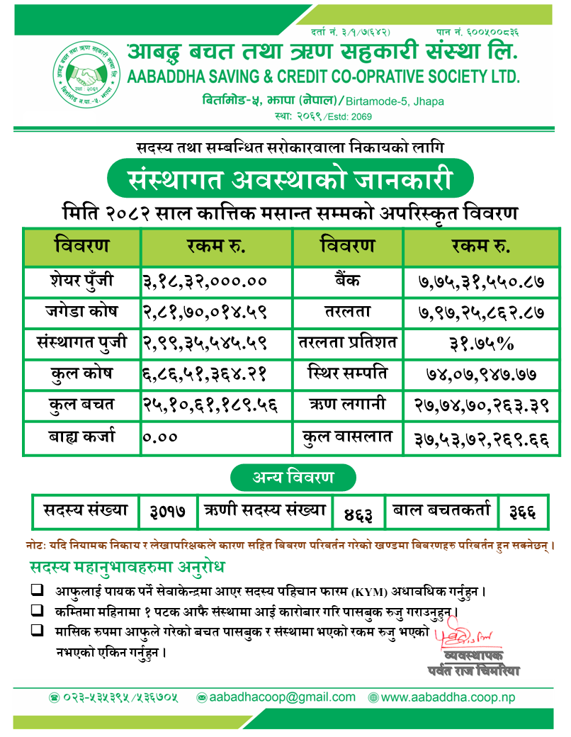 आबद्ध बचत तथा ऋण सहकारी संस्था लि. लामो समयको विभिन्न आरोह अवरोहहरु पार गर्दै सम्पुर्ण सदस्यहरुको संस्थाप्रतिको अगाध स्नेह, विश्वास, भरोसा, माया र सहयोगका कारणले झापा जिल्लाकै एक अब्बल संस्थाको रुपमा पहिचान कायम गर्न सफल भएको छ। यस अवधिमा संस्था सदस्यहरुले सुनिश्चित भएर बचत तथा ऋण कारोबार गर्नसक्ने सवल र सुरक्षित वित्तीय संस्थाको भरपर्दो विकल्प बन्न सफल भएको छ। संस्थालाई पहिलो रोजाईको संस्था बनाउने प्रयासस्वरुप सदस्यहरुको सन्तुष्टि र गुणस्तरीय सेवा प्रदानलाई प्राथमिकतामा राख्दै सोही अनुरुप ब्यवस्थापन प्रणालीलाई विकास गर्दै लगिएको छ। अझै प्रभावकारी ब्यवस्थापनको लागि सम्पूर्ण सदस्य तथा शुभचिन्तकहरुमा रचनात्मक सल्लाह सुझाव प्रदान गरी मार्गनिर्देशन गरी दिनुहुन अनुरोध छ। हामी सम्पूर्ण कर्मचारीहरु सदैव संस्थामा आवद्ध सदस्यहरुको आवश्यकता र सन्तुष्टिमा केन्द्रीत भई गुणस्तरीय सेवा सुविधा सहज रुपमा उपलब्ध गराउन प्रतिवद्ध छौं।