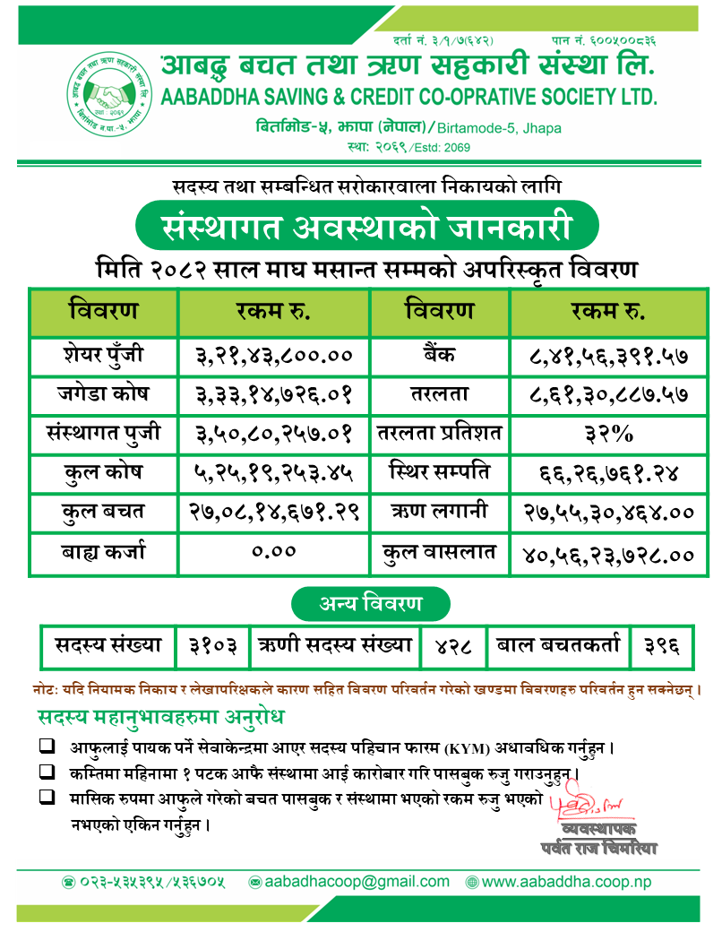 Welcome to the Aabaddha SACCOS, an organization committed to improving the economic, social, and cultural well-being of our members through a range of services including savings, credit, financial security, and remittance. Founded in 2069 BS, our vision is to become a premier business cooperative that meets the financial needs of our community. This website has been designed to provide our members with timely and accurate information about our activities and services, using the latest technology. We hope you find it useful and informative.