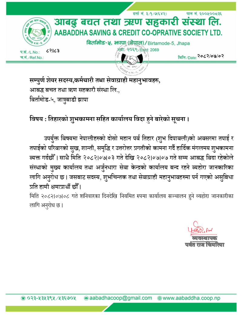 Read moreतिहारको शुभकामना सहित कार्यालय विदा हुने बारेको सूचना ।