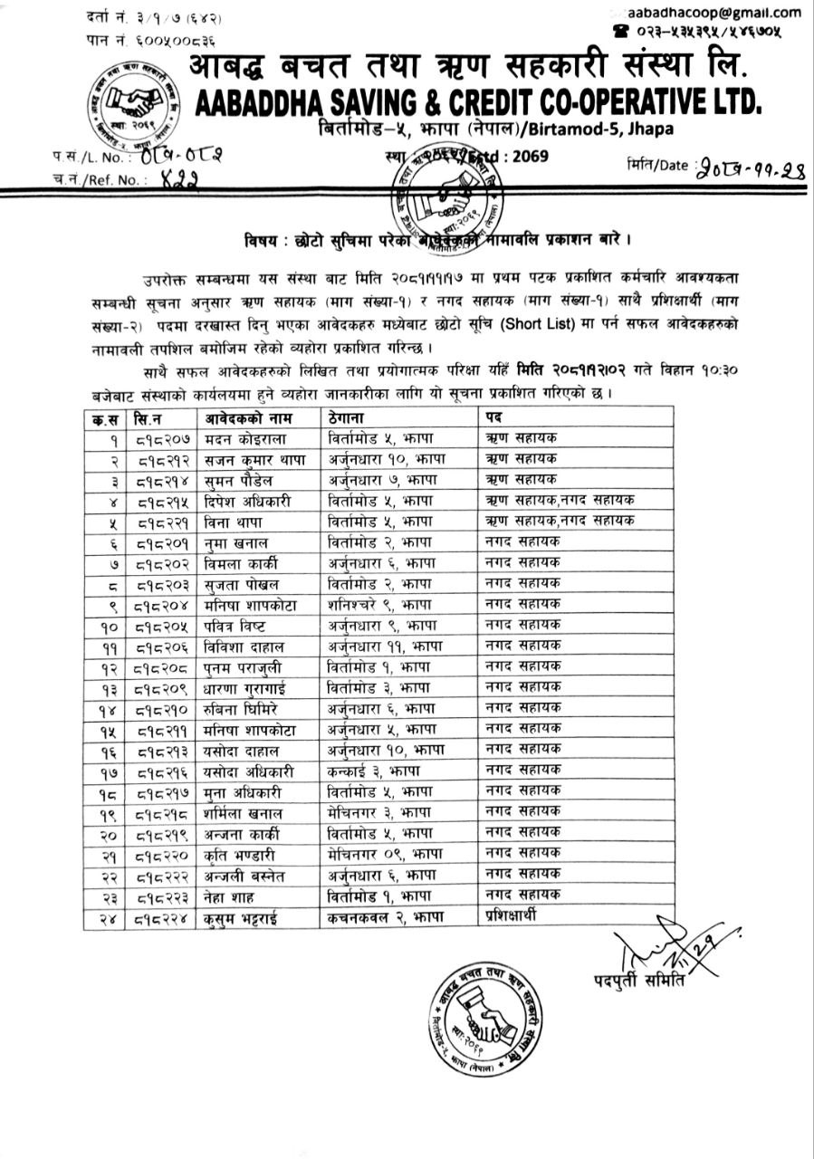 Careerछाेटो सूचिमा पर्न सफल आवेदकको नामावली प्रकाशन तथा परिक्षा हुने बारेको सूचना ।