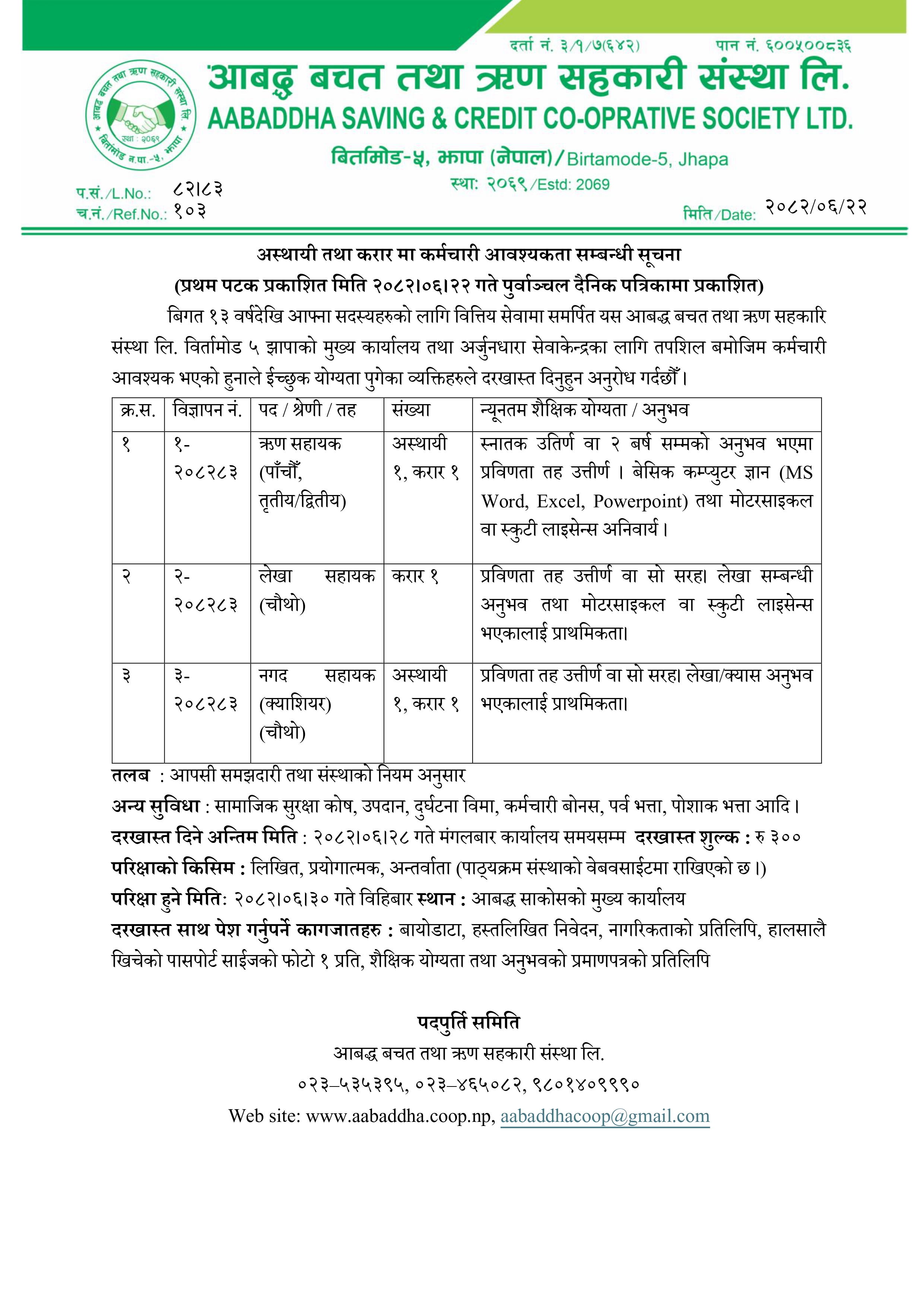 Careerकर्मचारी आवश्यकता सम्बन्धी सूचना